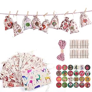 YUET Christmas Advent Calendar Bags Countdown Gift Cloth Bag 1-24 Days Pocket With Drawstring & Number Stickers, Resusable Xmas Party Decor Christmas Theme Fabric Hanging Craft Padding DIY