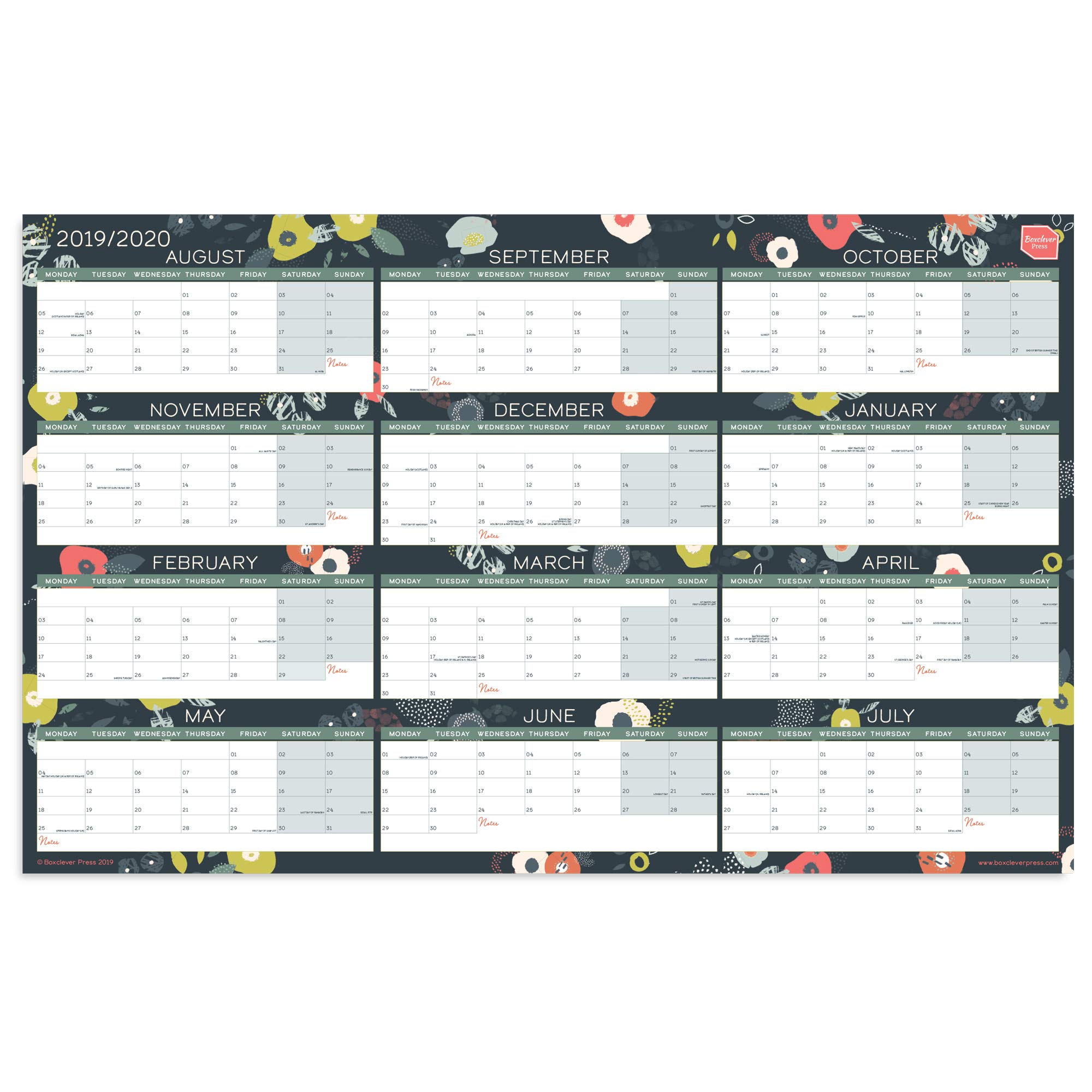 Measuring 70 x 43 cm big, the chart runs from January 2019 until December 2019 so is ideal in case you are a circle of relatives, home worker, teacher or student. Also useful in case you are planning a wedding, taking exams, planning studies, GCSE or A-level revision. Displaying the months in a line across the chart, it includes all of the main important UK dates and holidays and has shaded blocks for weekends.